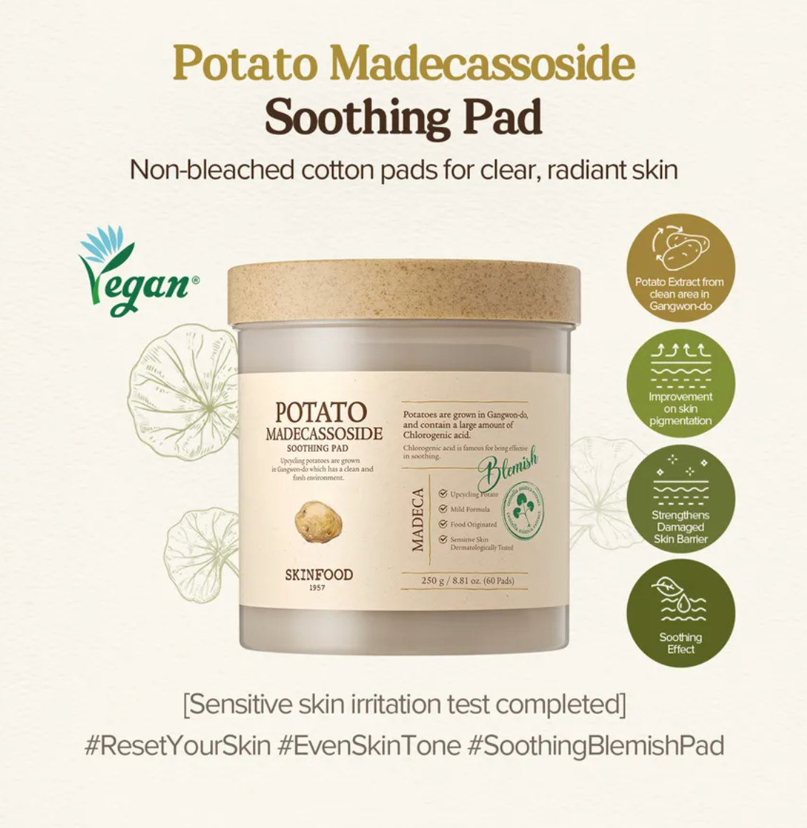 #Skinfood #PotatoPad #Madecassoside #SoothingPad #Kbeauty #UpcycledBeauty #SpotCare #SensitiveSkin #SkinBarrierRepair #BrighteningSkincare